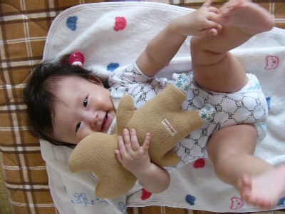 前へ進むのは、まだ「ハイハイ」とは少し違って、手がしっかり使えていないんですが、顔を布団にこすりつけながらお尻をブリン、ブリンと振って、ズリズリ進んでいます。
