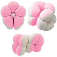 円座クッションではあるんですが、いろいろ変形可能で、↓のように、体勢に合わせて好みの形にぐにぐに~っとねじって使えます。ま、あんましそういう使い方はしてませんが、コロッと丸めてその辺に転がしておくと、円座クッションには見えず、なんだかカワイイです。